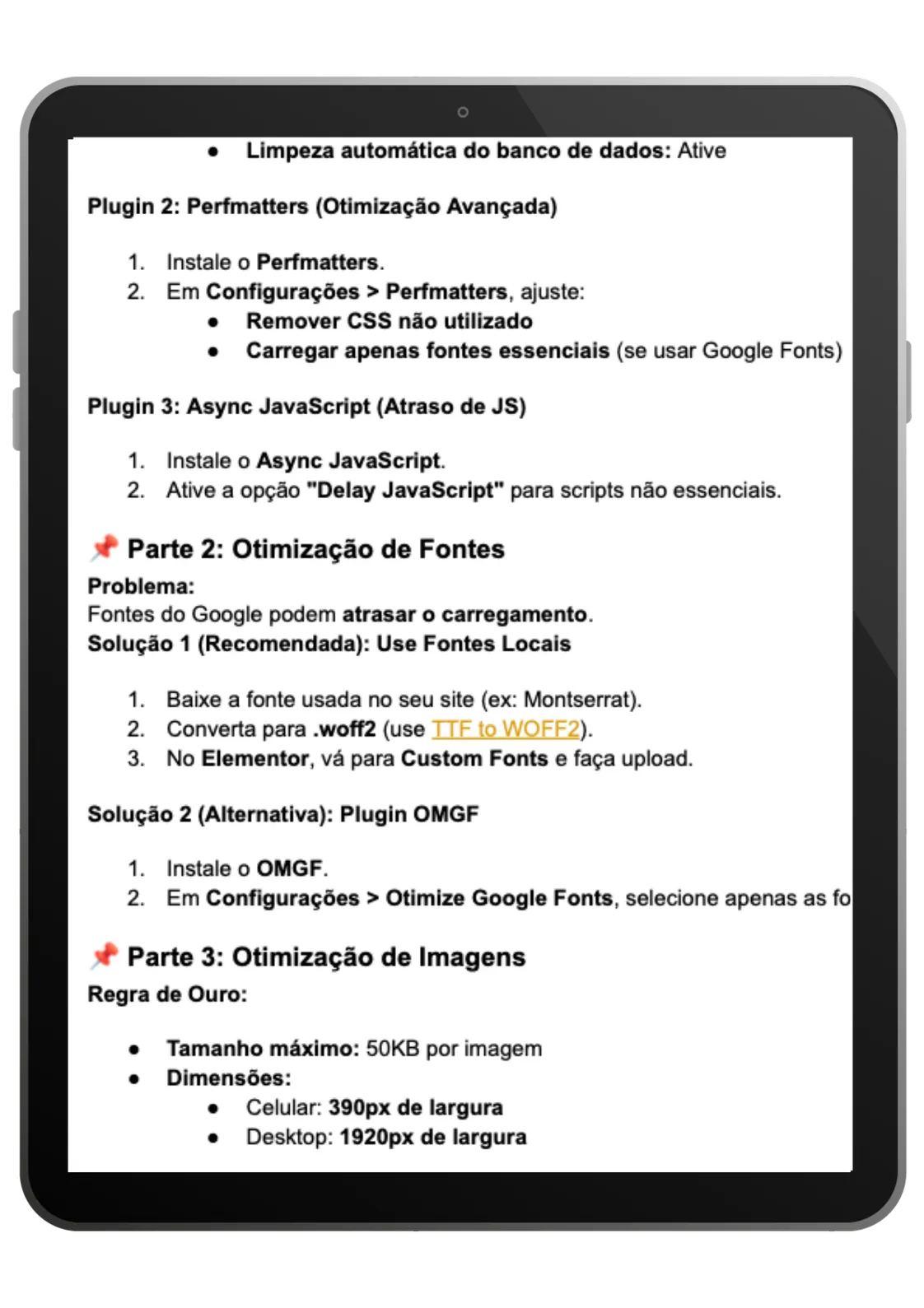 O que você vai receber não é um ebook “bonitinho” — é um material real que vai te mostrar como deixar sua página leve e pronta para venda.